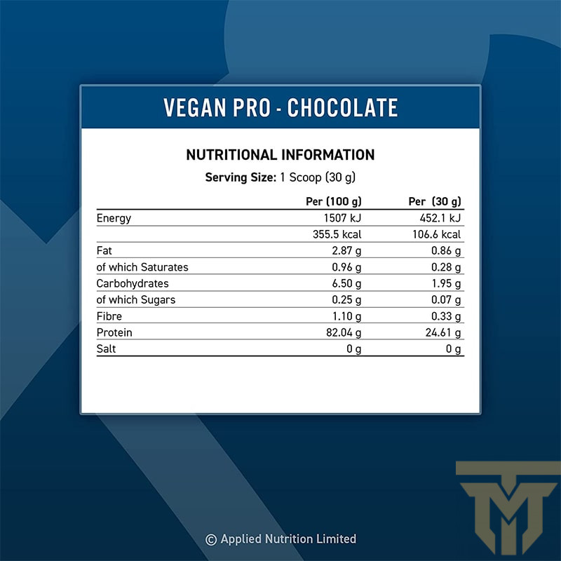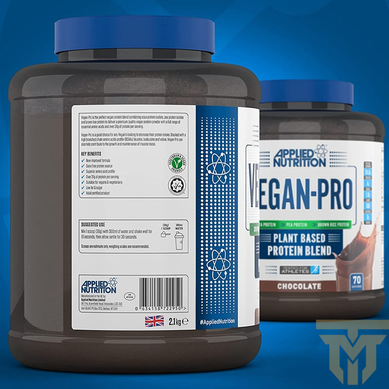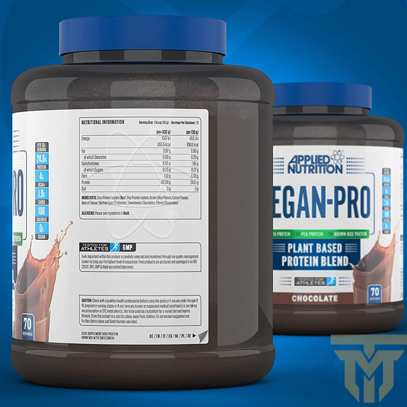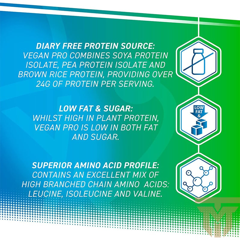 Vegan Pro به عنوان یک پودر پروتئین بدون لبنیات، ایزوله پروتئین سویا، ایزوله پروتئین نخود و پروتئین برنج قهوه ای را ترکیب می کند و بیش از ۲۴ گرم پروتئین در هر وعده ارائه می دهد.